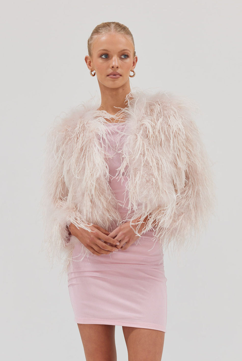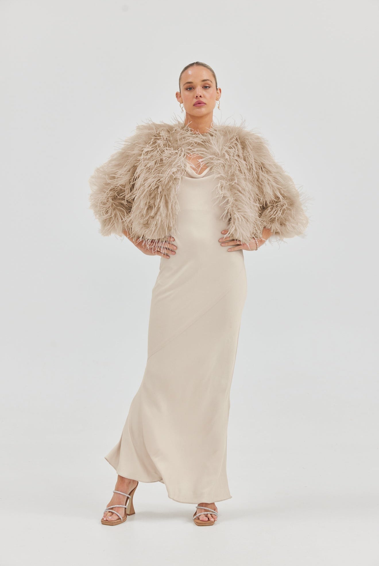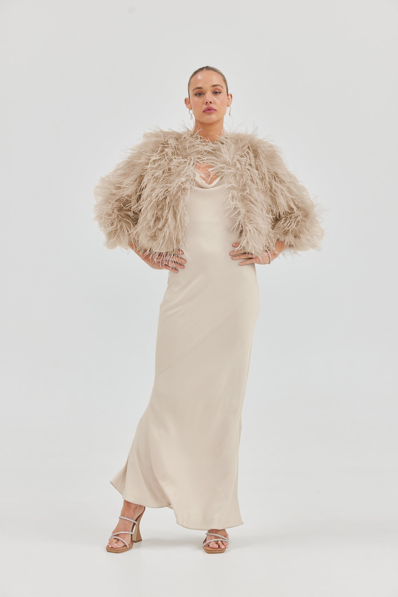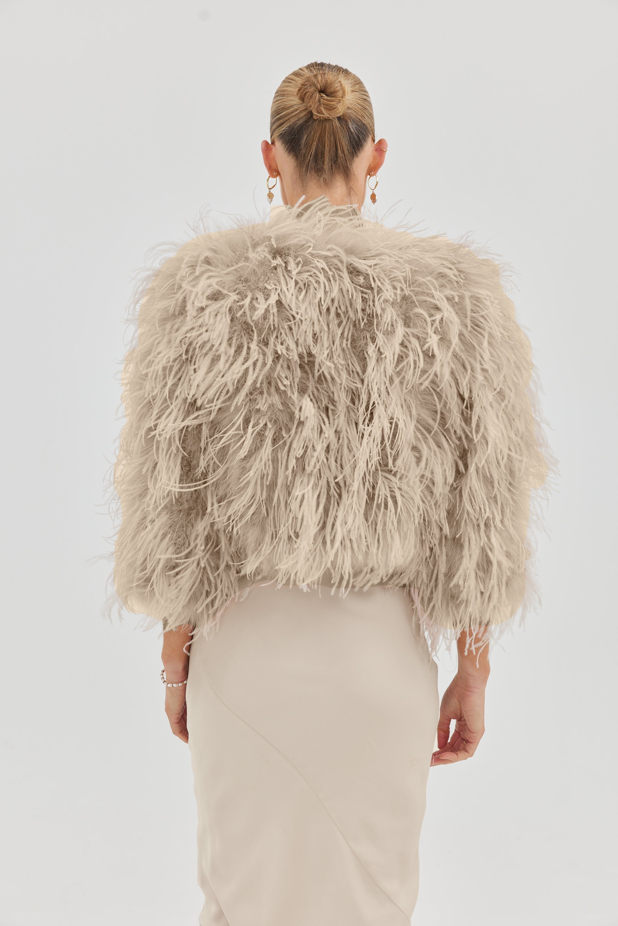 The Dahlia Feather Jacket has been a favourite with bride’s year after year. Handmade with whimsical Ostrich Feather, this cropped sleeve jacket is the most perfect piece for your wedding day or special occasions.