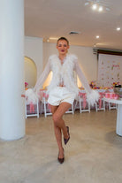 The Gigi Sheer Feather Blouse is a curated addition to your transeasonal wardrobe. Designed in a relaxed silhouette, the sheer blouse features Ostrich Feather trimming making it your go-to top for this party season.