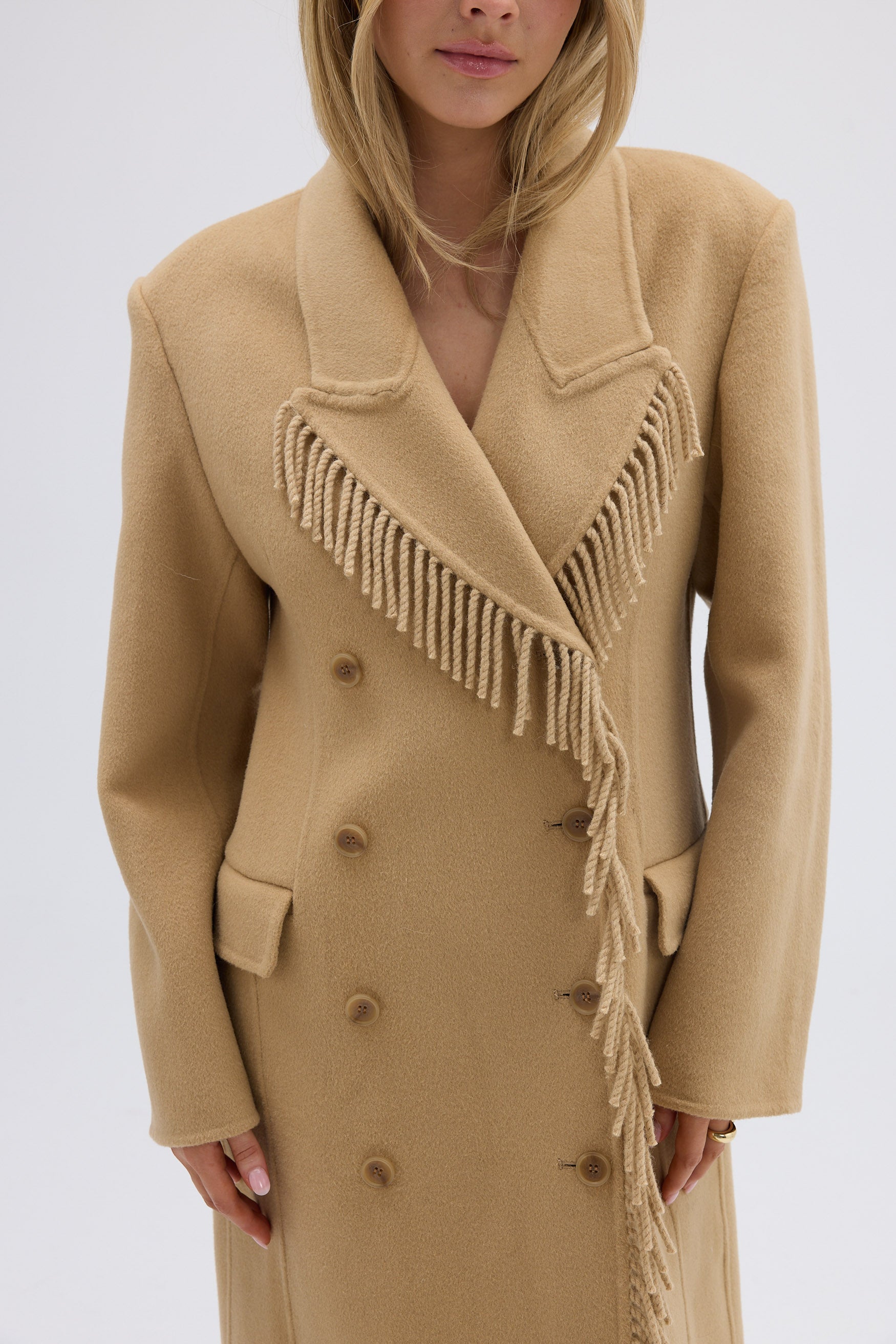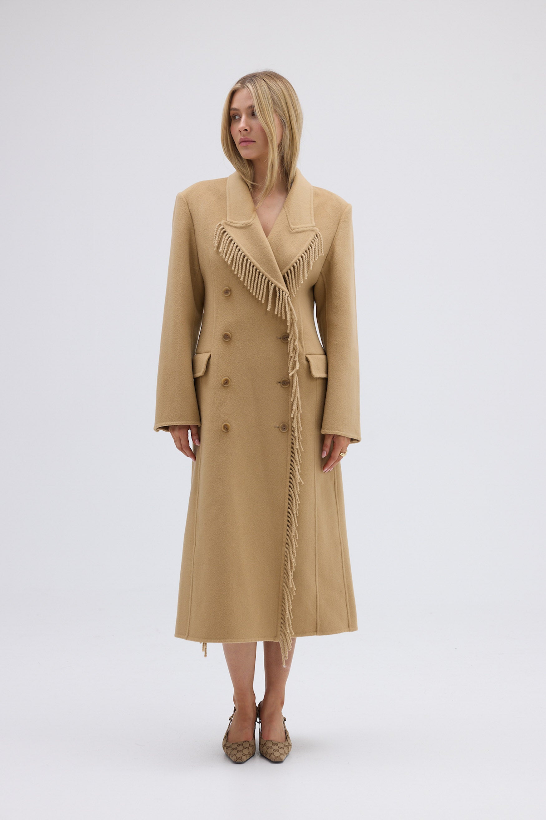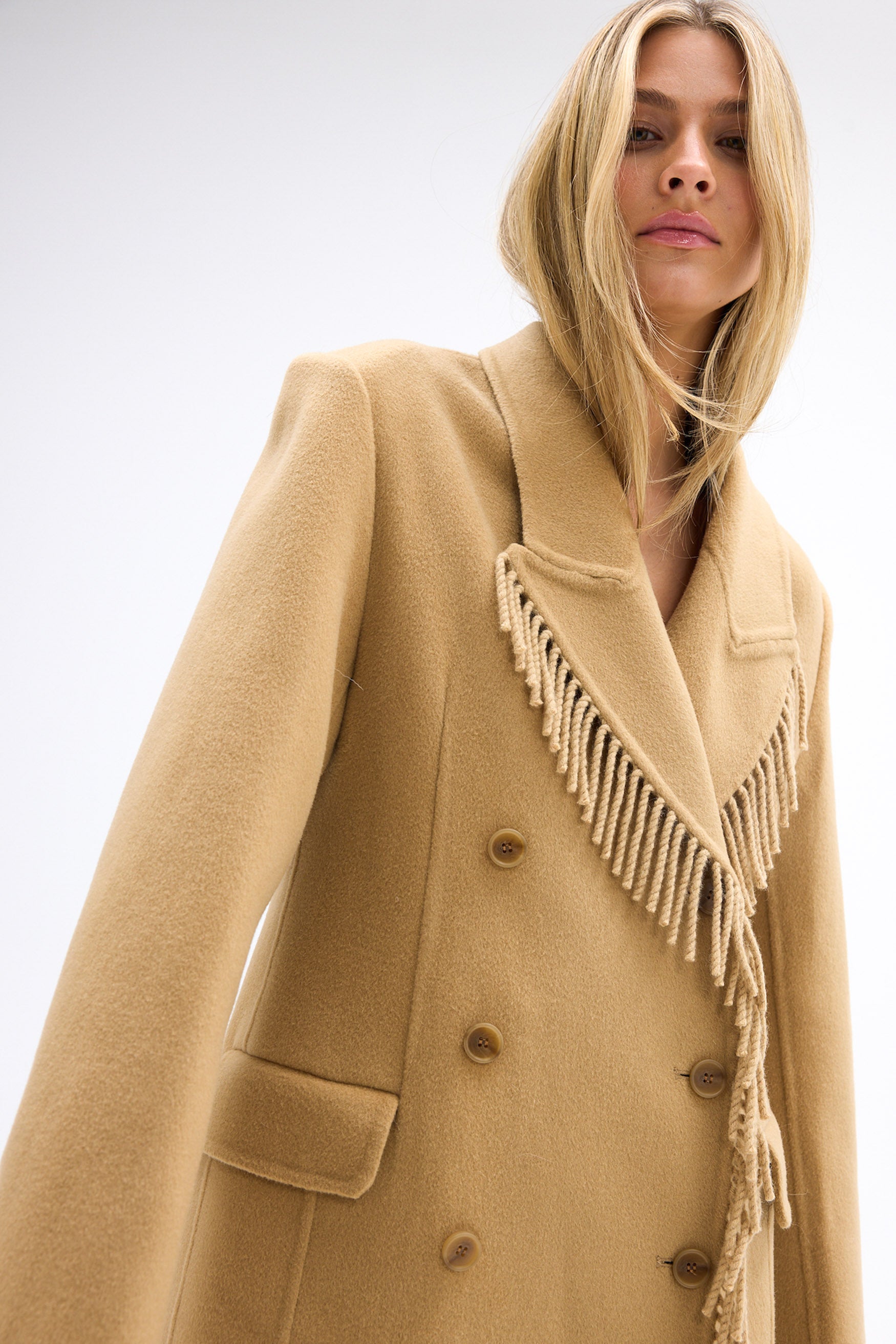Say hello to your Winter staple. Made from 100% wool this beautiful double-breasted coat has a structured and oversized silhouette with asymmetrical fringe detail that runs along the lapel edge and down the front, adding texture and movement to the classic design. The Kate Coat will forever be a special piece in your wardrobe. Model is 173cm tall and wears a size S.
