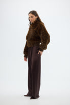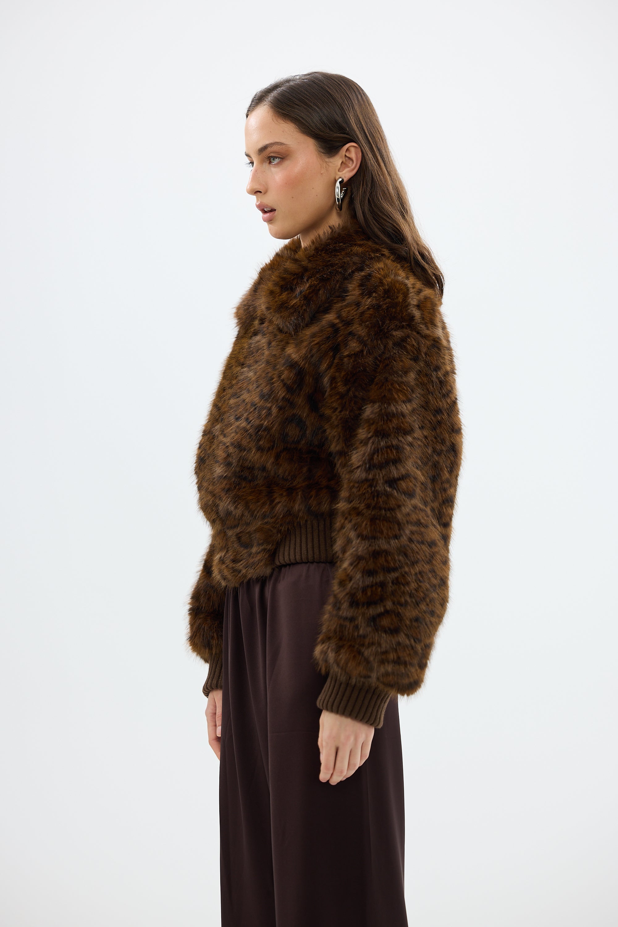 The Hailey Bomber is where off-duty cool meets statement outerwear. Crafted from plush faux fur in a bold leopard print, this cropped silhouette nods to classic bomber styling while feeling elevated and modern. Featuring ribbed knit cuffs and hem for a defined shape, it’s the statement jacket that will instantly transform any look — from denim and sneakers to a mini and heels.