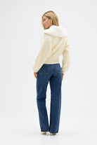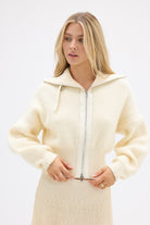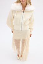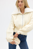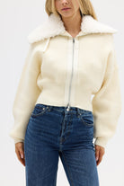 Meet the Ruby Knit Cardigan. Made from a beautifully soft wool blend fabrication, this stylish cardigan features a large, plush faux shearling collar that adds a luxurious and cozy texture to an easy-wearing design. The cardigan has a central zipper with a sleek faux leather trim that gives it a modern edge with sleeves that are voluminous with a slight balloon shape.
